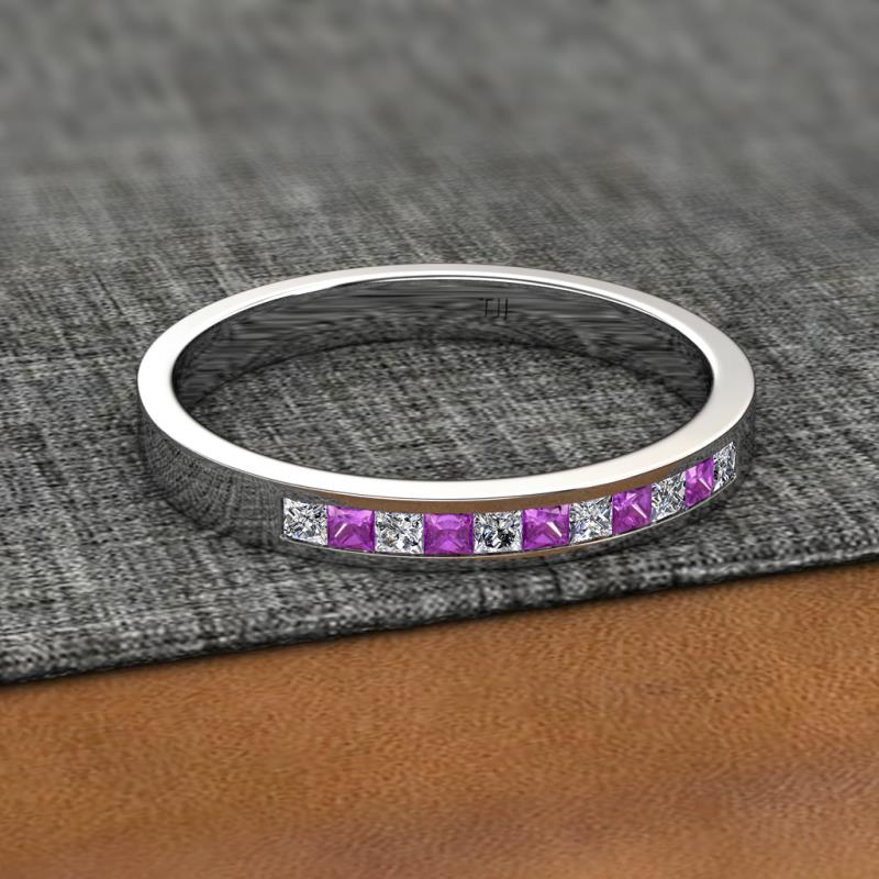 Shining with opulence and femine appeal, this Wedding Band inspires any attire with Glittering Princess Cut Channel Set Amethyst and Diamond making your Wedding day more Enduring.