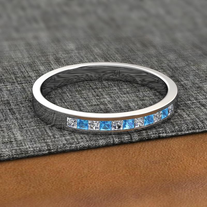 Shining with opulence and femine appeal, this Wedding Band inspires any attire with Glittering Princess Cut Channel Set Blue Topaz and Diamond making your Wedding day more Enduring.