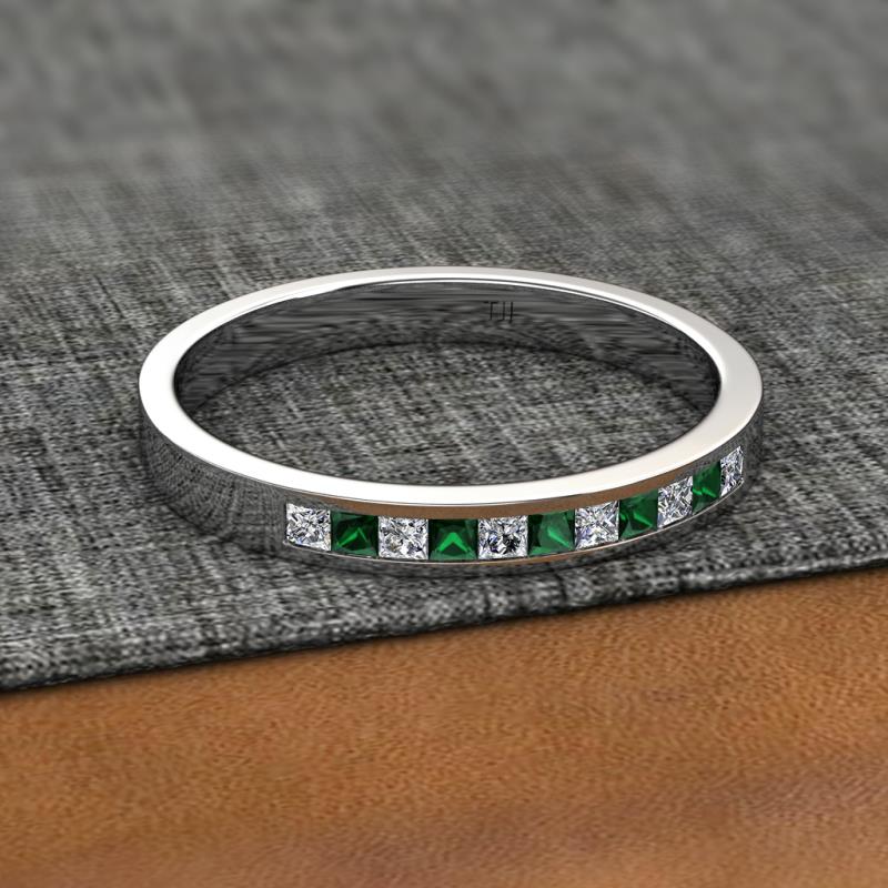 Shining with opulence and femine appeal, this Wedding Band inspires any attire with Glittering Princess Cut Channel Set Diamond and Chatham Created Emerald making your Wedding day more Enduring.