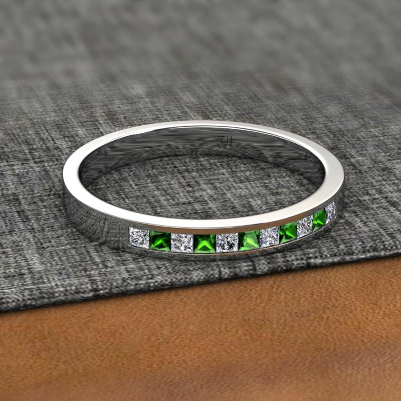 Shining with opulence and femine appeal, this Wedding Band inspires any attire with Glittering Princess Cut Channel Set Green Garnet and Diamond making your Wedding day more Enduring.