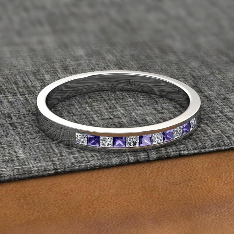 Shining with opulence and femine appeal, this Wedding Band inspires any attire with Glittering Princess Cut Channel Set Iolite and Diamond making your Wedding day more Enduring.