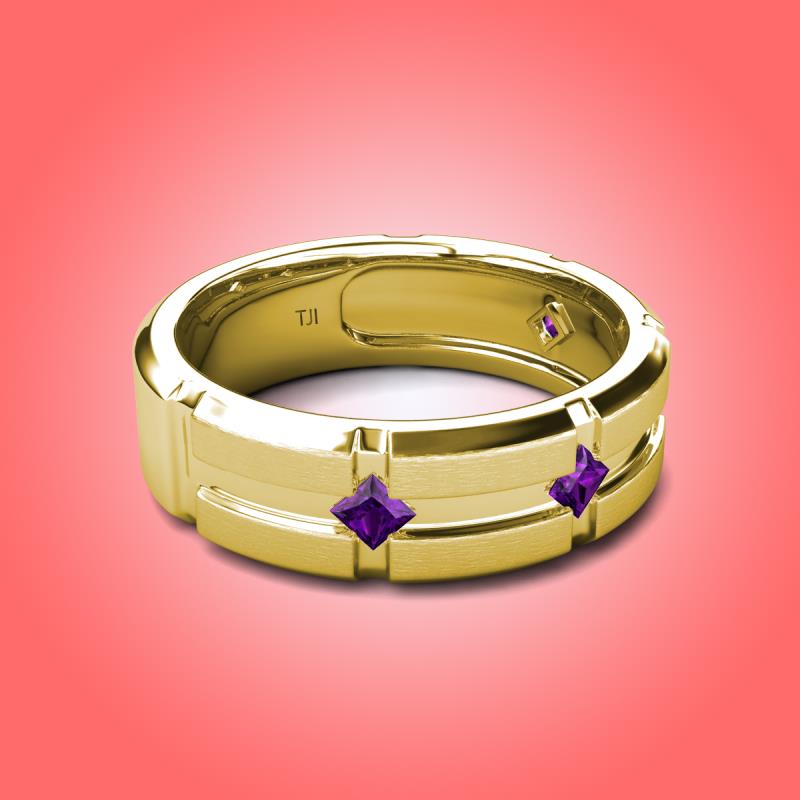 This 7.50 mm Four Stone Men's Wedding Band of 0.36 ctw with Kite Set Evenly Spaced Princess Cut Amethyst set in a Flush Setting is a symbol of commitment and promise towards your partner.