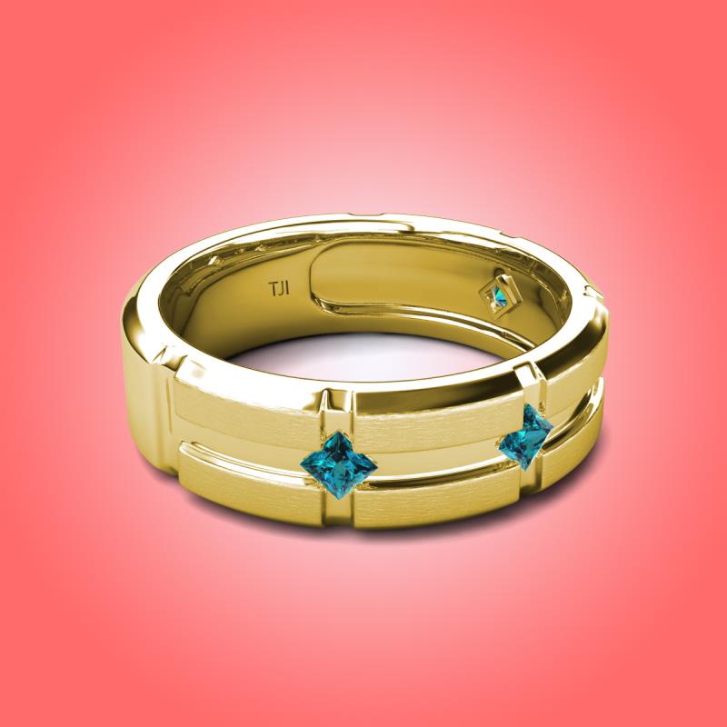 This 7.50 mm Four Stone Men's Wedding Band of 0.40 ctw with Kite Set Evenly Spaced Princess Cut Blue Diamond set in a Flush Setting is a symbol of commitment and promise towards your partner.