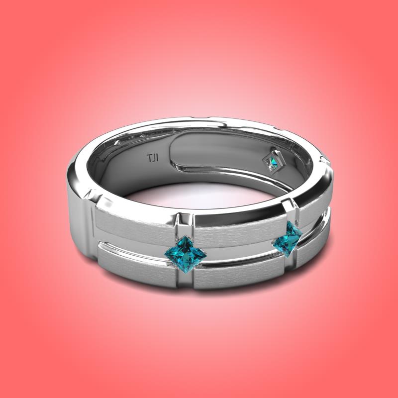 This 7.50 mm Four Stone Men's Wedding Band of 0.40 ctw with Kite Set Evenly Spaced Princess Cut Blue Diamond set in a Flush Setting is a symbol of commitment and promise towards your partner.