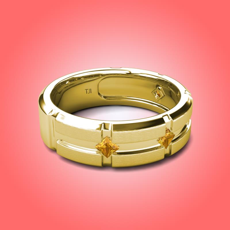 This 7.50 mm Four Stone Men's Wedding Band of 0.36 ctw with Kite Set Evenly Spaced Princess Cut Citrine set in a Flush Setting is a symbol of commitment and promise towards your partner.