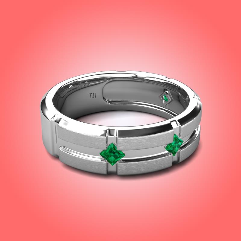 This 7.50 mm Four Stone Men's Wedding Band of 0.36 ctw with Kite Set Evenly Spaced Princess Cut Emerald set in a Flush Setting is a symbol of commitment and promise towards your partner.