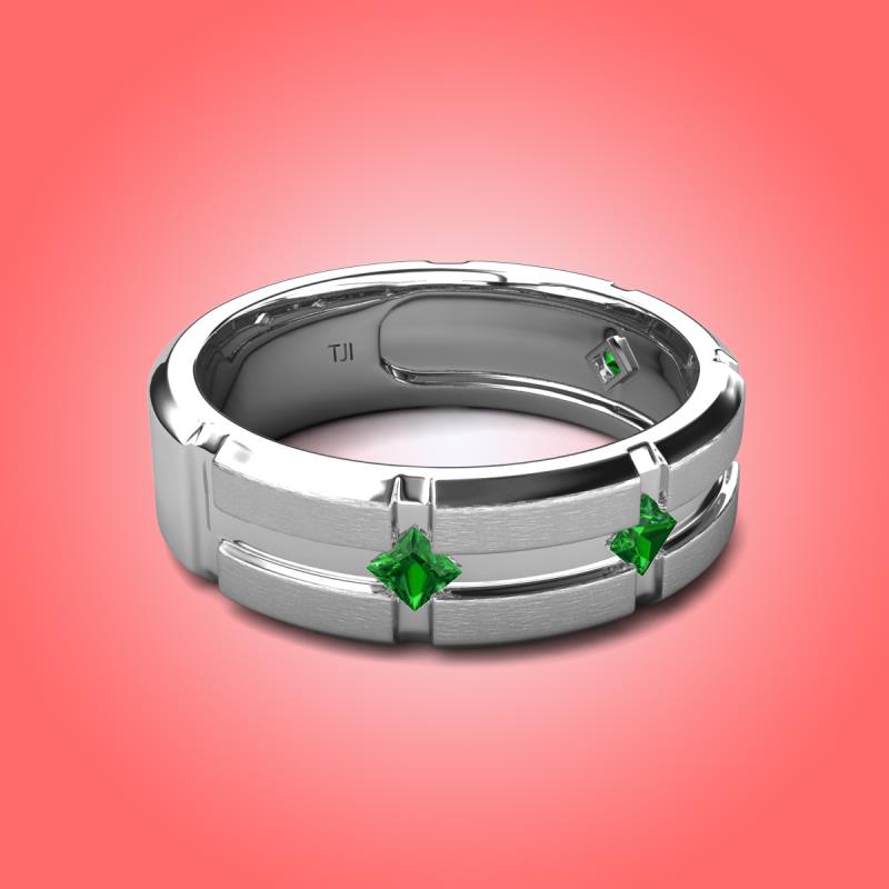 This 7.50 mm Four Stone Men's Wedding Band of 0.36 ctw with Kite Set Evenly Spaced Princess Cut Green Garnet set in a Flush Setting is a symbol of commitment and promise towards your partner.