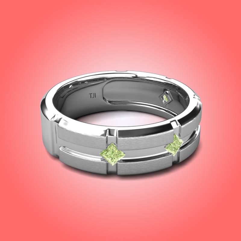 This 7.50 mm Four Stone Men's Wedding Band of 0.40 ctw with Kite Set Evenly Spaced Princess Cut Peridot set in a Flush Setting is a symbol of commitment and promise towards your partner.