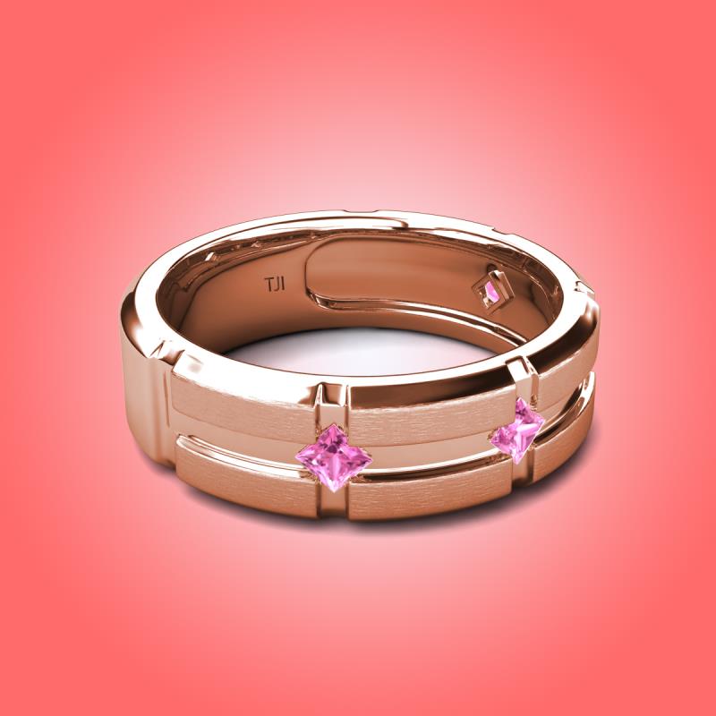 This 7.50 mm Four Stone Men's Wedding Band of 0.36 ctw with Kite Set Evenly Spaced Princess Cut Pink Sapphire set in a Flush Setting is a symbol of commitment and promise towards your partner.