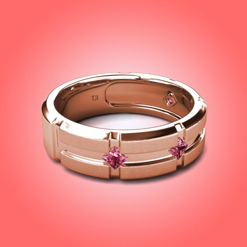 This 7.50 mm Four Stone Men's Wedding Band of 0.36 ctw with Kite Set Evenly Spaced Princess Cut Pink Tourmaline set in a Flush Setting is a symbol of commitment and promise towards your partner.