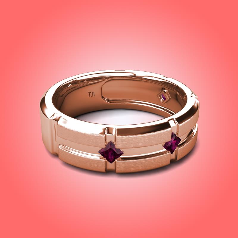 This 7.50 mm Four Stone Men's Wedding Band of 0.40 ctw with Kite Set Evenly Spaced Princess Cut Rhodolite Garnet set in a Flush Setting is a symbol of commitment and promise towards your partner.