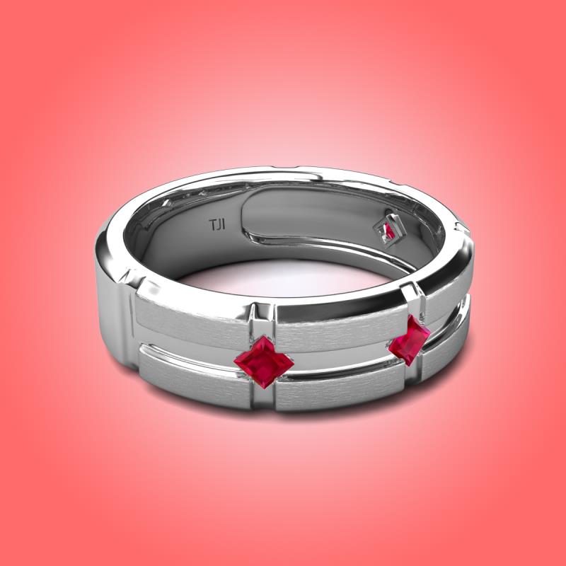 This 7.50 mm Four Stone Men's Wedding Band of 0.36 ctw with Kite Set Evenly Spaced Princess Cut Ruby set in a Flush Setting is a symbol of commitment and promise towards your partner.