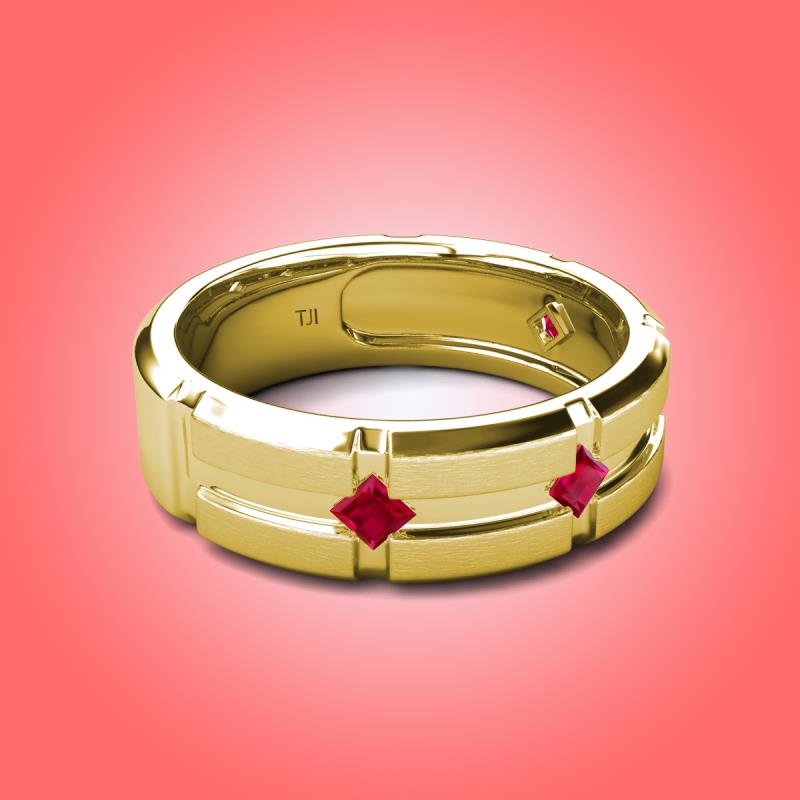 This 7.50 mm Four Stone Men's Wedding Band of 0.36 ctw with Kite Set Evenly Spaced Princess Cut Ruby set in a Flush Setting is a symbol of commitment and promise towards your partner.