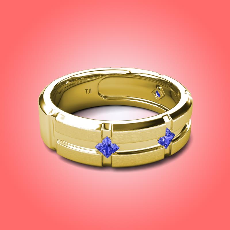 This 7.50 mm Four Stone Men's Wedding Band of 0.40 ctw with Kite Set Evenly Spaced Princess Cut Tanzanite set in a Flush Setting is a symbol of commitment and promise towards your partner.