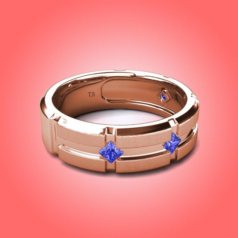 This 7.50 mm Four Stone Men's Wedding Band of 0.40 ctw with Kite Set Evenly Spaced Princess Cut Tanzanite set in a Flush Setting is a symbol of commitment and promise towards your partner.