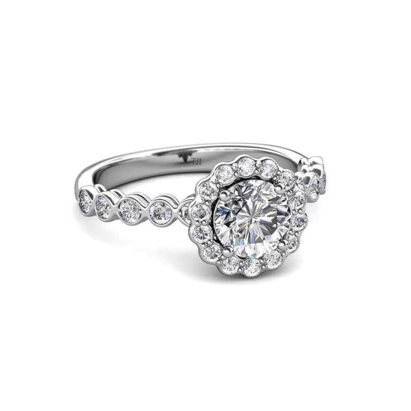 A Blend of Elegance added to this beautiful Halo Engagement Ring showing a single row floral scallop head of Halo Diamonds with Diamond at the Center along with designer pave set Diamond shank enhancing this gorgeous Ring.