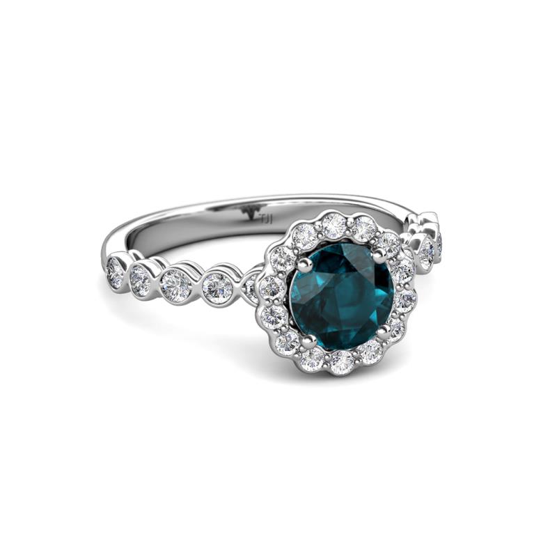 A Blend of Elegance added to this beautiful Halo Engagement Ring showing a single row floral scallop head of Halo Diamonds with London Blue Topaz at the Center along with designer pave set Diamond shank enhancing this gorgeous Ring.