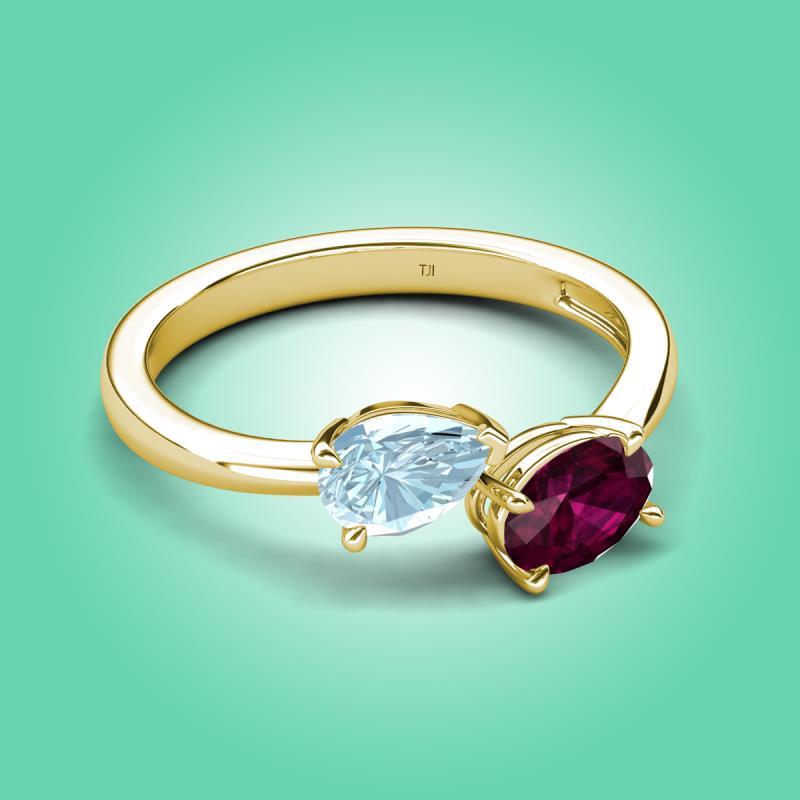 1.60 ctw Aquamarine Pear Shape 7x5 mm & Rhodolite Garnet Oval Shape 7x5 mm with Prong setting Two Stone Duo Women Engagement Ring in 14K Yellow Gold More Details ...