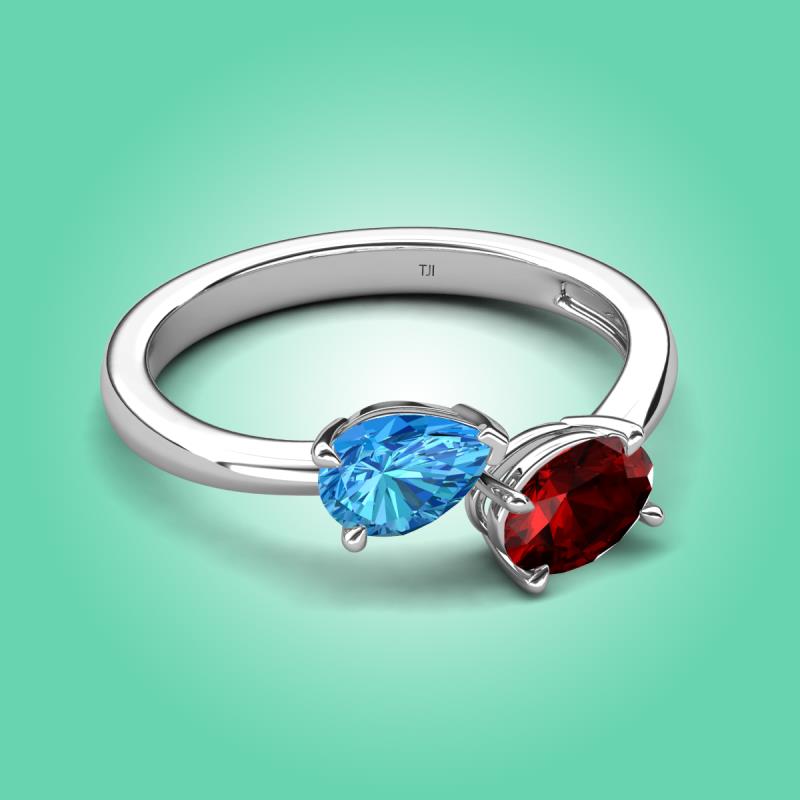 1.80 ctw Blue Topaz Pear Shape 7x5 mm & Red Garnet Oval Shape 7x5 mm with Prong setting Two Stone Duo Women Engagement Ring in 14K White Gold More Details ...