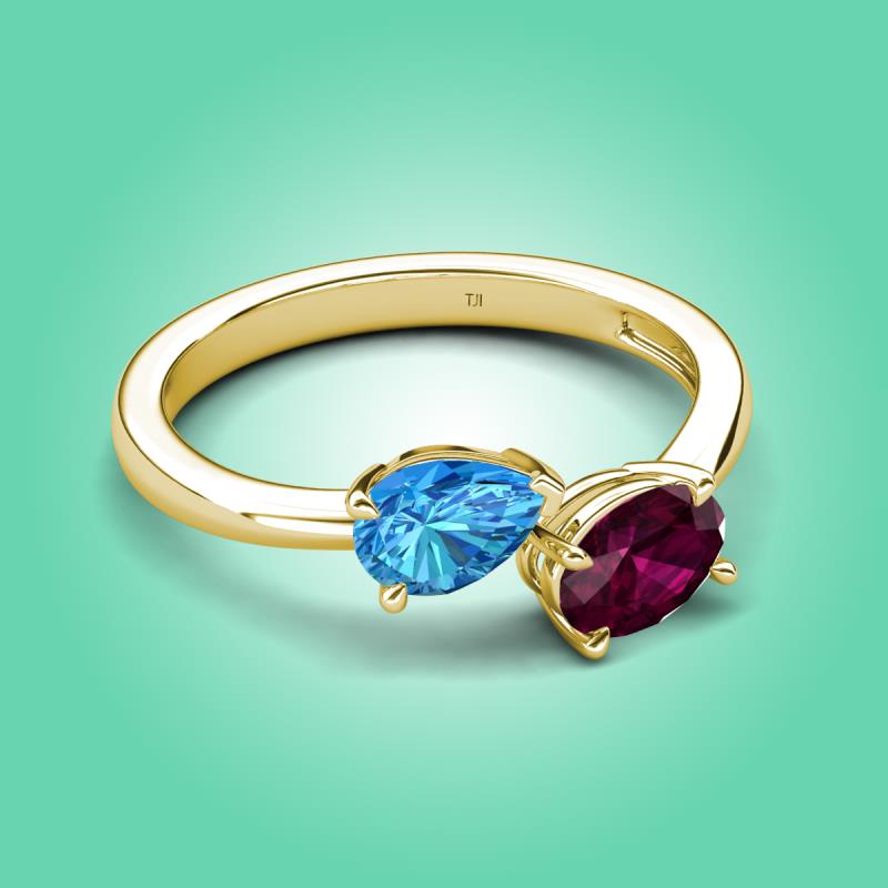 1.85 ctw Blue Topaz Pear Shape 7x5 mm & Rhodolite Garnet Oval Shape 7x5 mm with Prong setting Two Stone Duo Women Engagement Ring in 14K Yellow Gold More Details ...