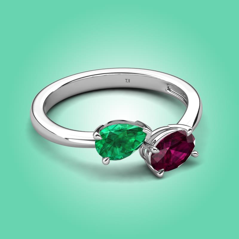 1.80 ctw Emerald Pear Shape 7x5 mm & Rhodolite Garnet Oval Shape 7x5 mm with Prong setting Two Stone Duo Women Engagement Ring in Platinum More Details ...