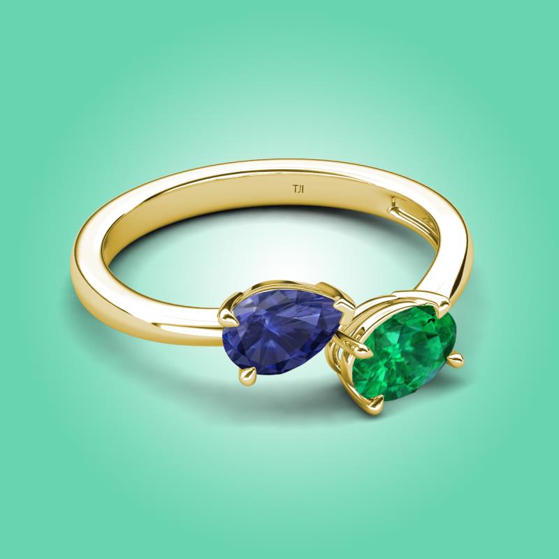 1.40 ctw Iolite Pear Shape 7x5 mm & Emerald Oval Shape 7x5 mm with Prong setting Two Stone Duo Women Engagement Ring in 18K Yellow Gold More Details ...
