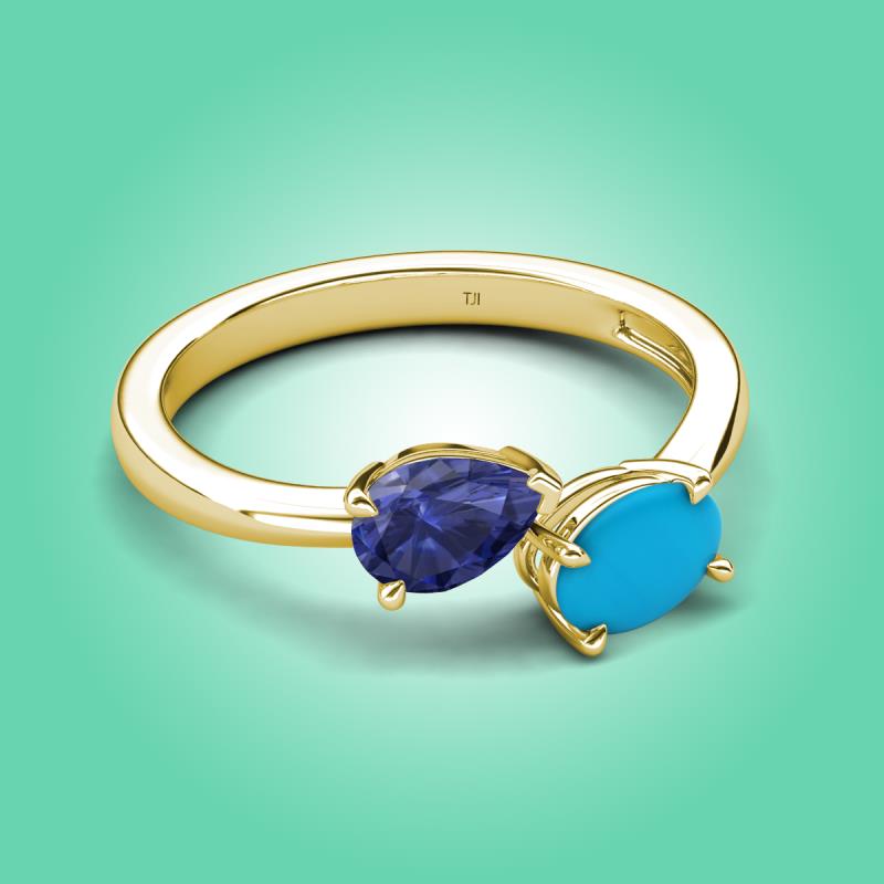 1.30 ctw Iolite Pear Shape 7x5 mm & Turquoise Oval Shape 7x5 mm with Prong setting Two Stone Duo Women Engagement Ring in 18K Yellow Gold More Details ...