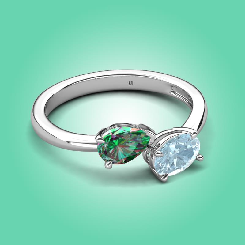 • 1 Lab Created Alexandrite Pear Shape 0.86 ctw/7x5 mm and 1 Aquamarine Oval Shape 0.72 ctw/7x5 mm Two Stone Duo Engagement Ring set in a Prong Setting.