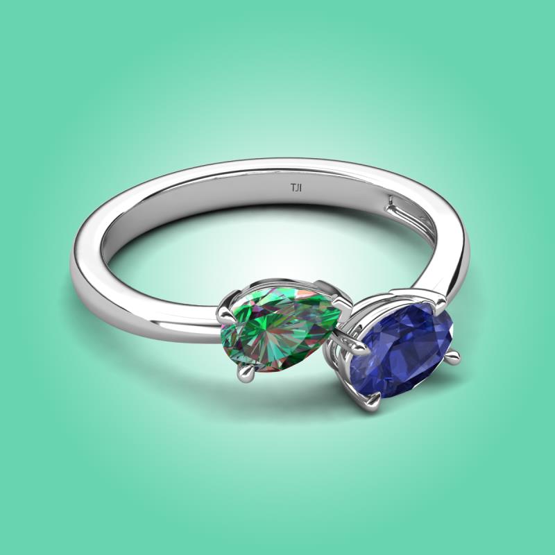 • 1 Lab Created Alexandrite Pear Shape 0.86 ctw /7x5 mm and Iolite 1 Oval Shape 0.67 ctw /7x5 mm Two Stone Duo Engagement Ring set in a Prong Setting.