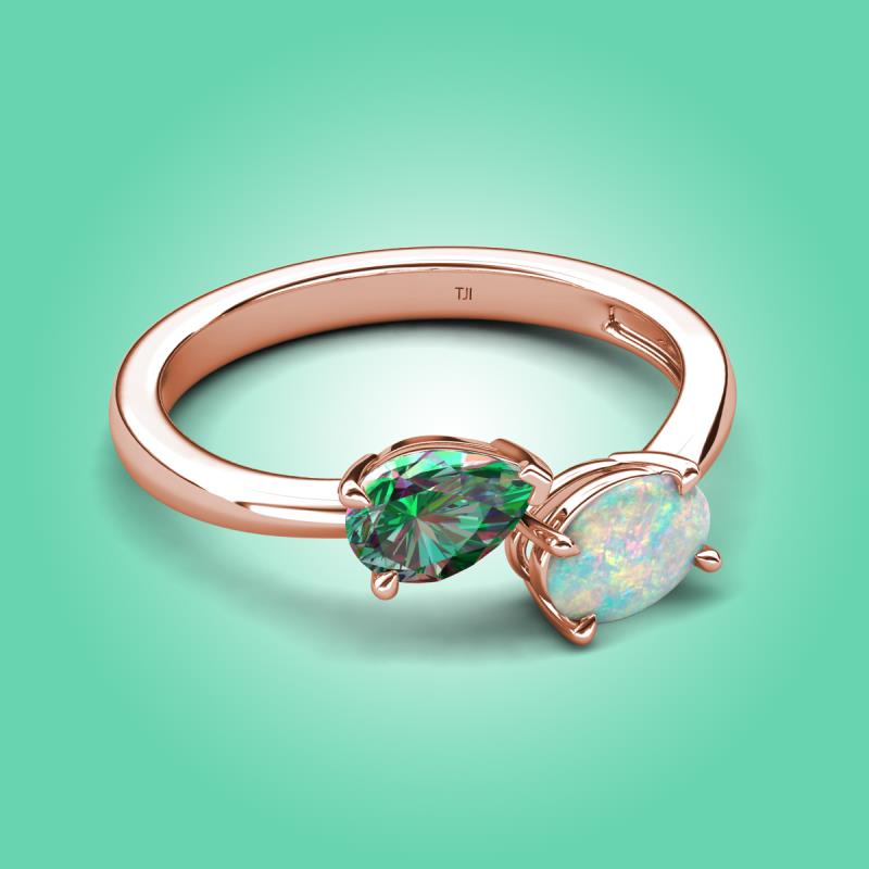The Lab Created Alexandrite Pear Shape and Opal Oval Shape Toi Et Moi Duo Ring of 1.36 ctw is the perfect representation of your unique and everlasting bond. The pear and oval shaped gemstones set in a Prong setting, complement each other perfectly, creating a stunning and timeless design that will capture the heart of your loved one, symbolizing your eternal love and commitment that will last a lifetime.