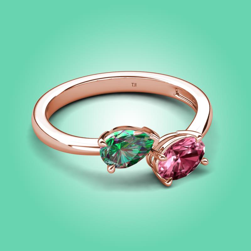 • 1 Lab Created Alexandrite Pear Shape 0.86 ctw /7x5 mm and Pink Tourmaline 1 Oval Shape 0.85 ctw /7x5 mm Two Stone Duo Engagement Ring set in a Prong Setting.