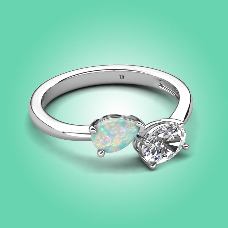 The Opal Pear Shape and White Sapphire Oval Shape Toi Et Moi Duo Ring of 1.35 ctw is the perfect representation of your unique and everlasting bond. The pear and oval shaped gemstones set in a Prong setting, complement each other perfectly, creating a stunning and timeless design that will capture the heart of your loved one, symbolizing your eternal love and commitment that will last a lifetime.