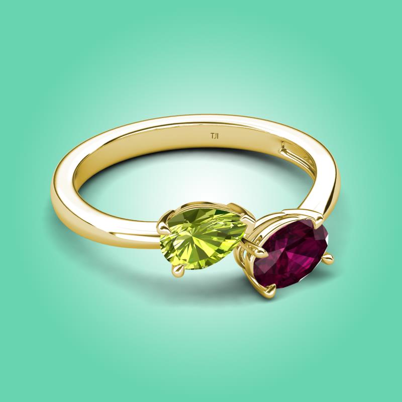 1.80 ctw Peridot Pear Shape 7x5 mm & Rhodolite Garnet Oval Shape 7x5 mm with Prong setting Two Stone Duo Women Engagement Ring in 14K Yellow Gold More Details ...