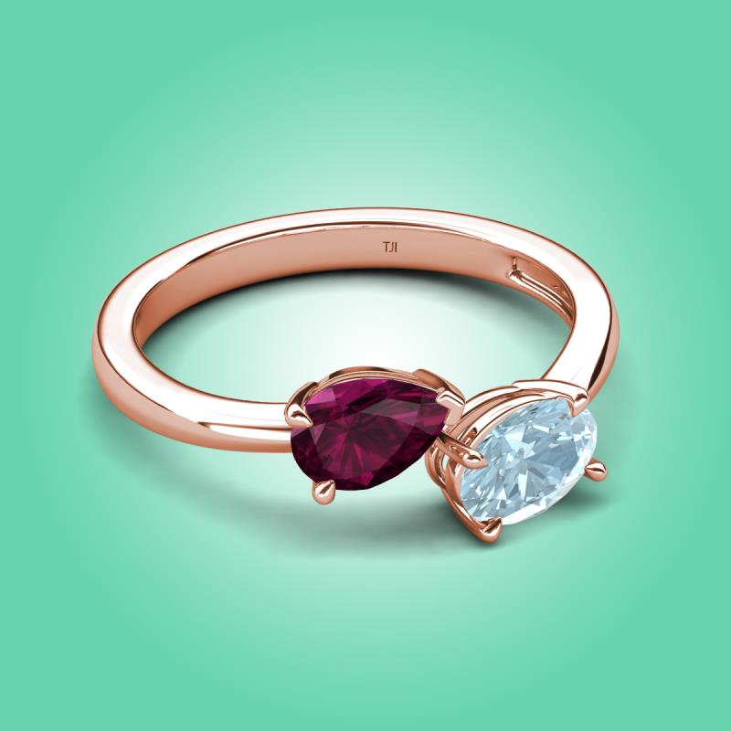 1.62 ctw Rhodolite Garnet Pear Shape 7x5 mm & Aquamarine Oval Shape 7x5 mm with Prong setting Two Stone Duo Women Engagement Ring in 18K Rose Gold More Details ...