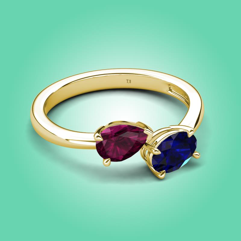 1.80 ctw Rhodolite Garnet Pear Shape 7x5 mm & Blue Sapphire Oval Shape 7x5 mm with Prong setting Two Stone Duo Women Engagement Ring in 18K Yellow Gold More Details ...