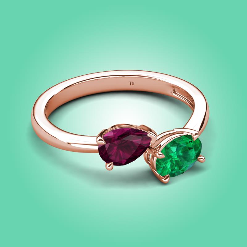 The Rhodolite Garnet Pear Shape and Emerald Oval Shape Toi Et Moi Duo Ring of 1.70 ctw is the perfect representation of your unique and everlasting bond. The pear and oval shaped gemstones set in a Prong setting, complement each other perfectly, creating a stunning and timeless design that will capture the heart of your loved one, symbolizing your eternal love and commitment that will last a lifetime.