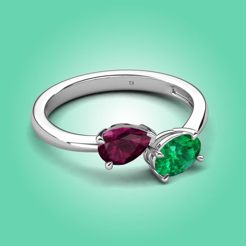 1.70 ctw Rhodolite Garnet Pear Shape 7x5 mm & Emerald Oval Shape 7x5 mm with Prong setting Two Stone Duo Women Engagement Ring in 18K White Gold More Details ...
