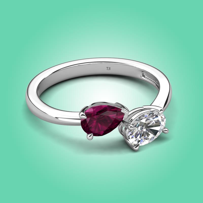 The Rhodolite Garnet Pear Shape and GIA Certified Natural Diamond Oval Shape Toi Et Moi Duo Ring of 1.70 ctw is the perfect representation of your unique and everlasting bond. The pear and oval shaped gemstones set in a Prong setting, complement each other perfectly, creating a stunning and timeless design that will capture the heart of your loved one, symbolizing your eternal love and commitment that will last a lifetime.