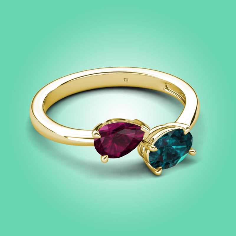 1.90 ctw Rhodolite Garnet Pear Shape 7x5 mm & London Blue Topaz Oval Shape 7x5 mm with Prong setting Two Stone Duo Women Engagement Ring in 14K Yellow Gold More Details ...