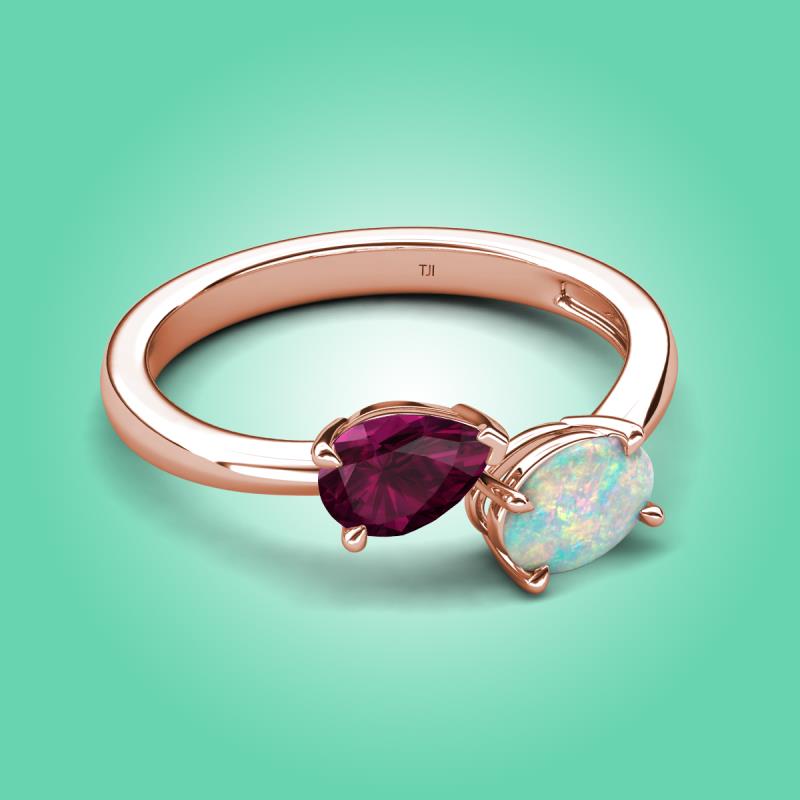 The Rhodolite Garnet Pear Shape and Opal Oval Shape Toi Et Moi Duo Ring of 1.40 ctw is the perfect representation of your unique and everlasting bond. The pear and oval shaped gemstones set in a Prong setting, complement each other perfectly, creating a stunning and timeless design that will capture the heart of your loved one, symbolizing your eternal love and commitment that will last a lifetime.
