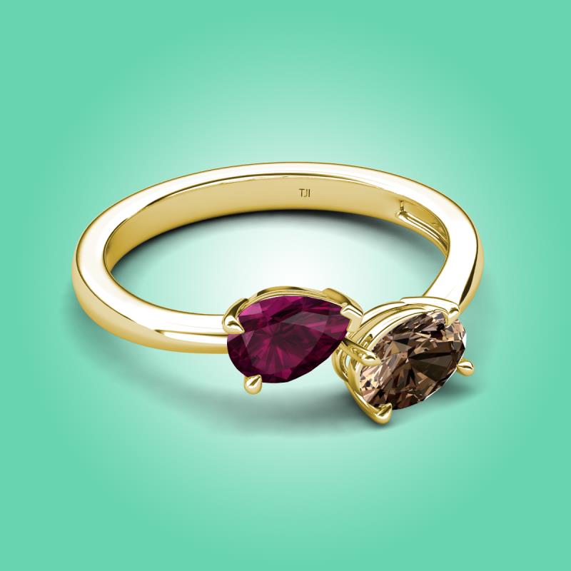 1.65 ctw Rhodolite Garnet Pear Shape 7x5 mm & Smoky Quartz Oval Shape 7x5 mm with Prong setting Two Stone Duo Women Engagement Ring in 18K Yellow Gold More Details ...