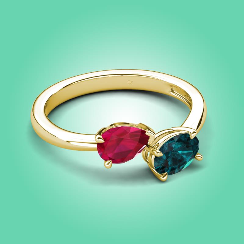 1.95 ctw Ruby Pear Shape 7x5 mm & London Blue Topaz Oval Shape 7x5 mm with Prong setting Two Stone Duo Women Engagement Ring in 18K Yellow Gold More Details ...