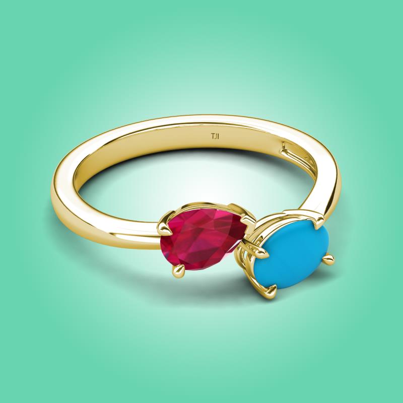 1.65 ctw Ruby Pear Shape 7x5 mm & Turquoise Oval Shape 7x5 mm with Prong setting Two Stone Duo Women Engagement Ring in 18K Yellow Gold More Details ...