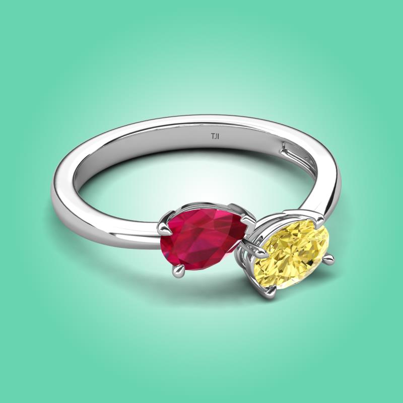 The Ruby Pear Shape and Yellow Sapphire Oval Shape Toi Et Moi Duo Ring of 1.95 ctw is the perfect representation of your unique and everlasting bond. The pear and oval shaped gemstones set in a Prong setting, complement each other perfectly, creating a stunning and timeless design that will capture the heart of your loved one, symbolizing your eternal love and commitment that will last a lifetime.