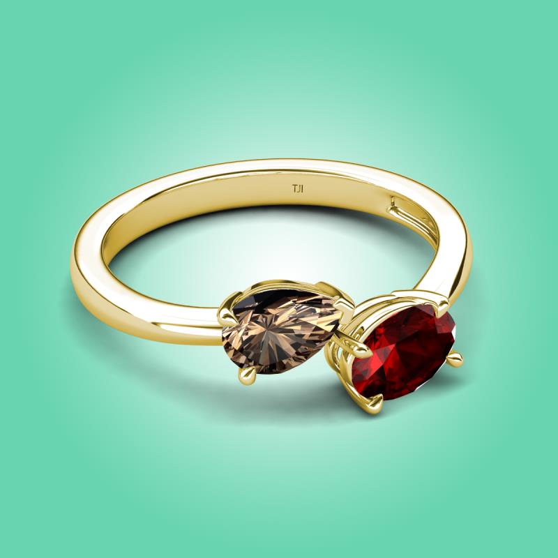 1.60 ctw Smoky Quartz Pear Shape 7x5 mm & Red Garnet Oval Shape 7x5 mm with Prong setting Two Stone Duo Women Engagement Ring in 18K Yellow Gold More Details ...