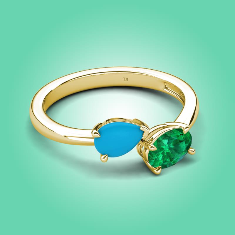 1.15 ctw Turquoise Pear Shape 7x5 mm & Emerald Oval Shape 7x5 mm with Prong setting Two Stone Duo Women Engagement Ring in 14K Yellow Gold More Details ...