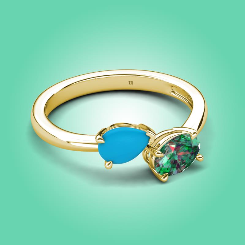 1.51 ctw Turquoise Pear Shape 7x5 mm & Lab Created Alexandrite Oval Shape 7x5 mm with Prong setting Two Stone Duo Women Engagement Ring in 18K Yellow Gold More Details ...