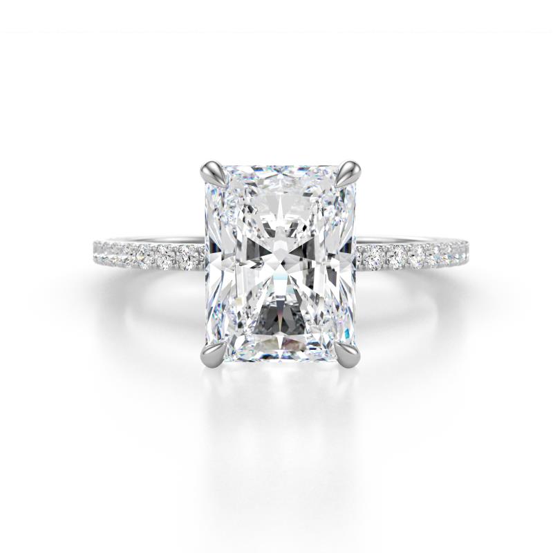 An exquisite Semi mount engagement ring adorned with a shimmering concealed halo of Lab Grown Diamonds encircling the center, elegantly complemented by a petite band to frame it with timeless grace.