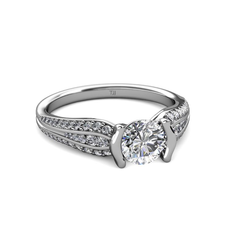 Exude elegance in the adorable beauty of this 1.39 ctw Engagement Ring with Pave set Natural Diamond shoulders continuing to three row graduated pave Natural Diamond shank accentuating the stunning Center IGI Certified Round Lab Grown Diamond which is half bezel set securely holding in place making it a perfect balance for a lady on the go.