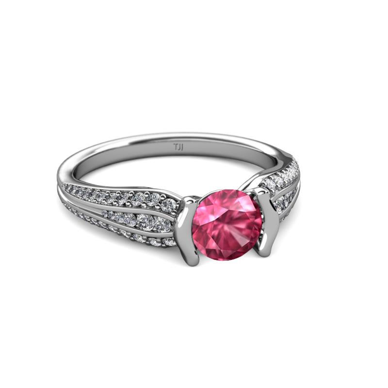 Exude elegance in the adorable beauty of this Engagement Ring with Pave set Diamond shoulders continuing to three row graduated pave diamond shank accentuating the stunning Center Pink Tourmaline which is half bezel set securely holding in place making it a perfect balance for a lady on the go.